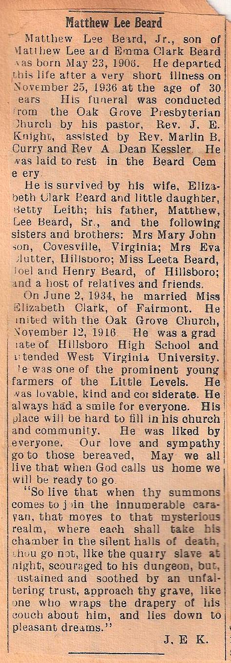 | Matthew Lee Beard, Jr. son of Matthew Lee and Emma Clark Beard was born May 23, 1906. He departed this life after a very short illness on November 25, 1936 at the age of 30 years. His funeral was conducted from the Oak Grove Presbyterian Church by his pastor, Rev. J. E. Knight assisted by Rev. Marlin B. Curry and Rev. A Dean Kessler. He was laid to rest in the Beard Cemetery. He is survived by his wife, Elizabeth Clark Beard and little daughter, Betty Leith; his father Matthew Lee Beard, Sr., and the following sisters and brothers; Mrs. Mary Johnson Covesville, Virginia; Mrs. Eva Clutter, Hillsboro; Miss Leeta Beard, Joel and Henry Beard, of Hillsboro; and a host of relatives and friends. On June 2, 1934, he married Miss Elizabeth Clark of Fairmont. he united with the Oak Grove Church November 12, 1916. he was a graduate of Hillsboro High School and attended West Virginia University. He was one of the prominent young farmers of the Little Levels. he was lovable, kind and considerate. He always had a smile for everyone. His place will be hard to fill in his church and community. He was liked by everyone. Our love and sympathy go to those bereaved. May we all live that when God calls us home we will be ready to go. "So live that when thy summons comes to join the innumerable caravan, that moves to that mysterious realm, where each shall take his chamber in the silent halls of death, thou go not, like the quarry slave at night, scourged to his dungeon, but sustained and soothed by an unfaltering trust, approach thy grave, like one who wraps the drapery of his couch about him and lies down to pleasant dreams." J. E. K. |