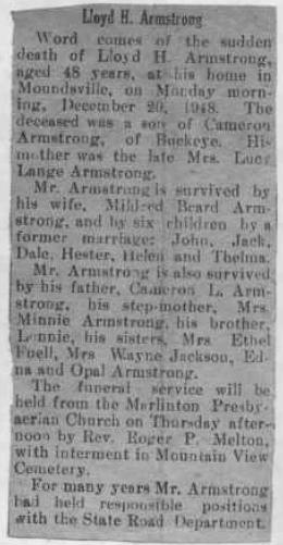 Obituary - Lloyd H. Armstrong - Word comes of the death of Lloyd H.