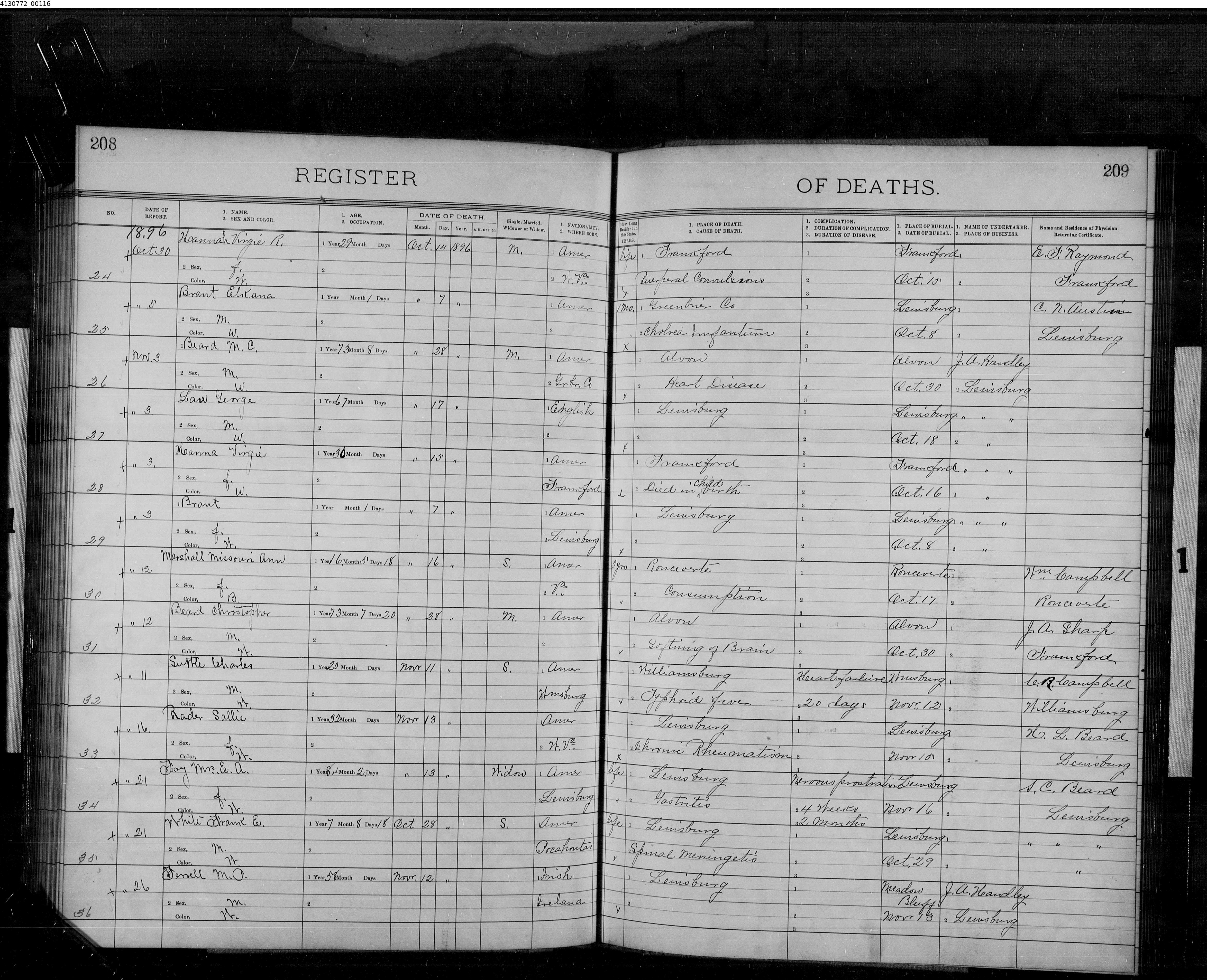 http://www.wvculture.org/vrr/va_view.aspx?Id=2893711&Type=Death Moses C. Beard M d 28 Oct 1896, Greenbrier County, WV, 72y 8m. Born Greenbrier County, WV, Spouse Sarah I. Beard, Occupation Farmer. Mother Nancy Beard, Father Jno. Beard. d Heart Disease. |