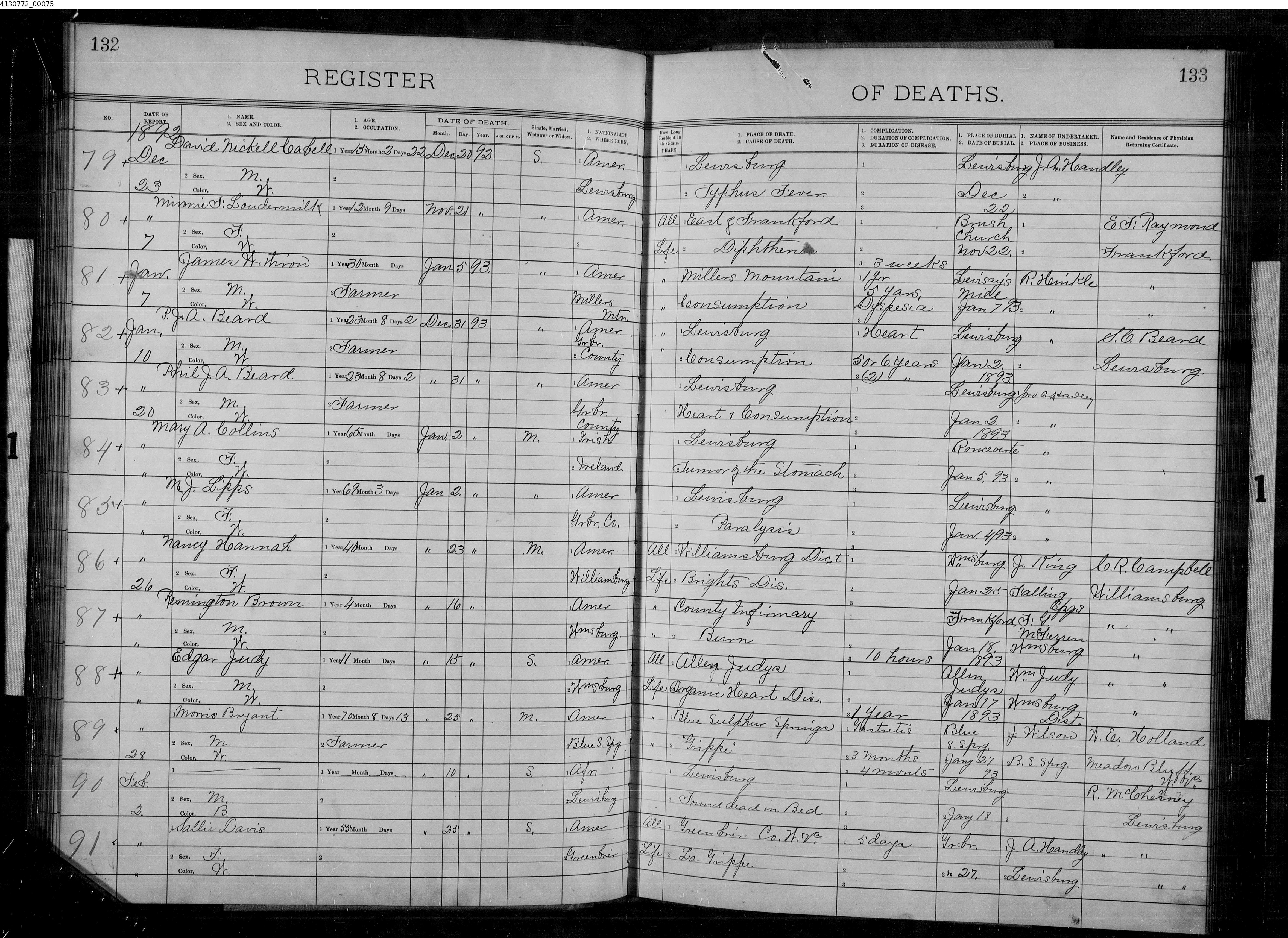 http://www.wvculture.org/vrr/va_view.aspx?Id=2897510&Type=Death Phil J. A. Beard, Male d 31 Dec 1893, Lewisburg, Greenbrier, WV, 23y 8m 2d, Lewisburg, buried 2 Jan 1893. Born Grbr. County, S. d Heart + Consumption |