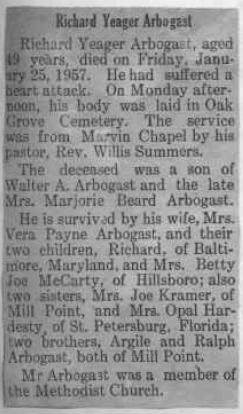 | Obituary - Richard Yeager Arbogast - aged 49 years, died on Friday, January 25, 1957. He had suffered a heart attack. On Monday afternoon, his body was laid in Oak Grove Cemetery. The service was from Marvin Chapel by his pastor, Rev. Willis Summers. The deceased was a son of Walter A. Arbogast and the late Mrs. Marjorie Beard Arbogast. He is survived by his wife, Mrs. Vera Payne Arbogast, and their two children, Richard of Baltimore, Maryland, and Mrs. Betty Joe McCarty, of Hillsboro; also two sisters; Mrs. Joe Kramer of Mill Point, and Mrs. Opal Hardesty of St. Petersburg, Florida; two brothers Argile and Ralph Arbogast, both of Mill Point. Mr. Arbogast was a member of the Methodist Church. |