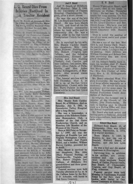 | Obituary - Edward Ross Beard - Edward Ross Beard, 45, of Chesapeake, Ohio, was killed Monday September 8, 1975, in a tractor accident. Born March 9, 1930, in Beckley, the son of Beulah Weiford Beard of Beckley, and the late Lynn Beard. He was a tool and die maker repairman in Huntington. Surviving him in addition to his mother, are seven children and one grandchild; three brothers; Ralph Beard of Dallas, Pennsylvania; Ray Beard of Chesapeake, Virginia, and Guy Beard of Flag, Arkansas. Funeral Services were held Monday in the Van Reenen Funeral Home by the Rev. Jack Arbuckle, with burial in the Oak Grove Cemetery at Hillsboro. |
