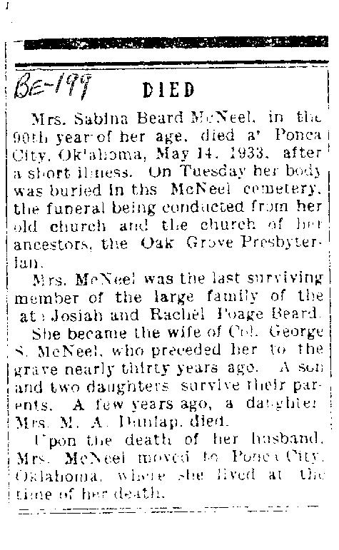 | Obituary : Mrs. Sabina Beard McNeel, 90th year of her age, died at Ponca City, OK May 14, 1933 after a short illness. On Tuesday she was buried in the McNeel Cemetery, the funeral being conducted from her old church and the church of her ancestors, the Oak Grove Presbyterian. Mrs. McNeel was the last surviving member of the Josiah and Rachel Poage Beard. She became the wife of Col. George S. McNeel, who preceded her in death by nearly thirty years ago. A son and two daughters survive their parents. A few years ago, a daughter Mrs. M.A.Dunlap, died. upon the death of her husband, Mrs. McNeel moved to Ponca City, OK where she lived at the time of her death. |