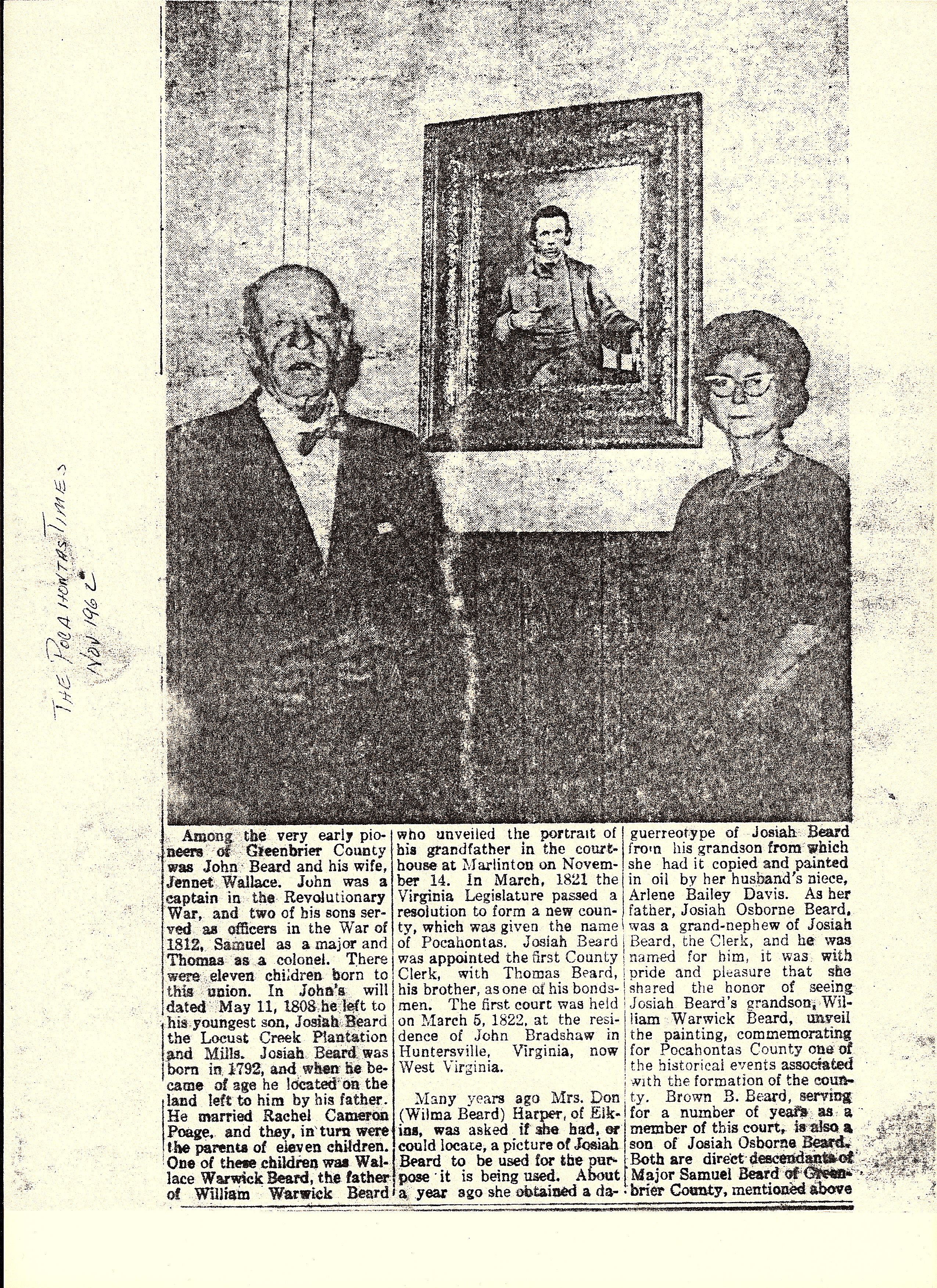 - Nov 1962 Among the very early pioneers of Greenbrier County was John Beard and his wife, Jennett Wallace. John was a captain in the Revolutionary War and two of his sons served as officers in the War of 1812. There were eleven children born to this union. In John's will dated May 11, 1808 he left to his youngest son Josiah Beard the Locust Creek Plantation and Mills. Josiah Beard was born in 1792, and when he became of age he located on the land left to him by his father. He married Rachel Cameron Poage, and they, in turn were the parents of eleven children. One of these children was Wallace Warwick Beard, the father of William Warwick Beard, who unveiled the portrait of his grandfather in the courthouse at Marlinton on November 14. In March, 1821, the Virginia legislature passed a resolution to form a new county which was given the name of Pocahontas. Josiah Beard was appointed as the first county clerk, with Thomas Beard, his brother, as one of the bondsmen. The first court was held on March 5, 1822, at the residence of John Bradshaw in Huntersville, Virginia, now West Virginia. Many years ago Mrs. Don (Wilma Beard) Harper, of Elkins, was asked if she had, or could locate, a picture of Josiah Beard to be used for the purpose it is being used. About a year ago she obtained a daguerreotype of Josiah Beard from his grandson from which she had it copied and painted in oil by her husbands niece, Arlene Bailey Davis. As her father, Josiah Osborne Beard, was a grand-nephew of Josiah Beard, the Clerk, and he was named for him, it was with pride and pleasure that she shred the honor seeing Josiah Beard's grandson, William Warwick Beard, unveil the painting, commemorating for Pocahontas County one of the historical events associated with the formation of the county. Brown B. Beard, serving for a number of years as a member of this court, is also the son of Josiah Osborne Beard. Both are direct descendents of Major Samuel Beard of Greenbrier County, mentioned above. |