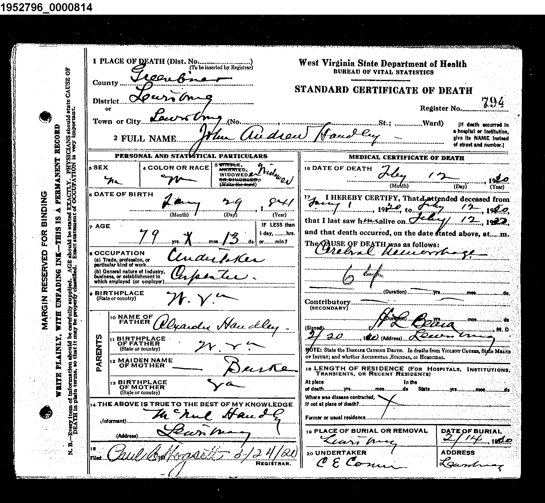 | Death Certificate : John A Handley, 13 Feb 1920 |
