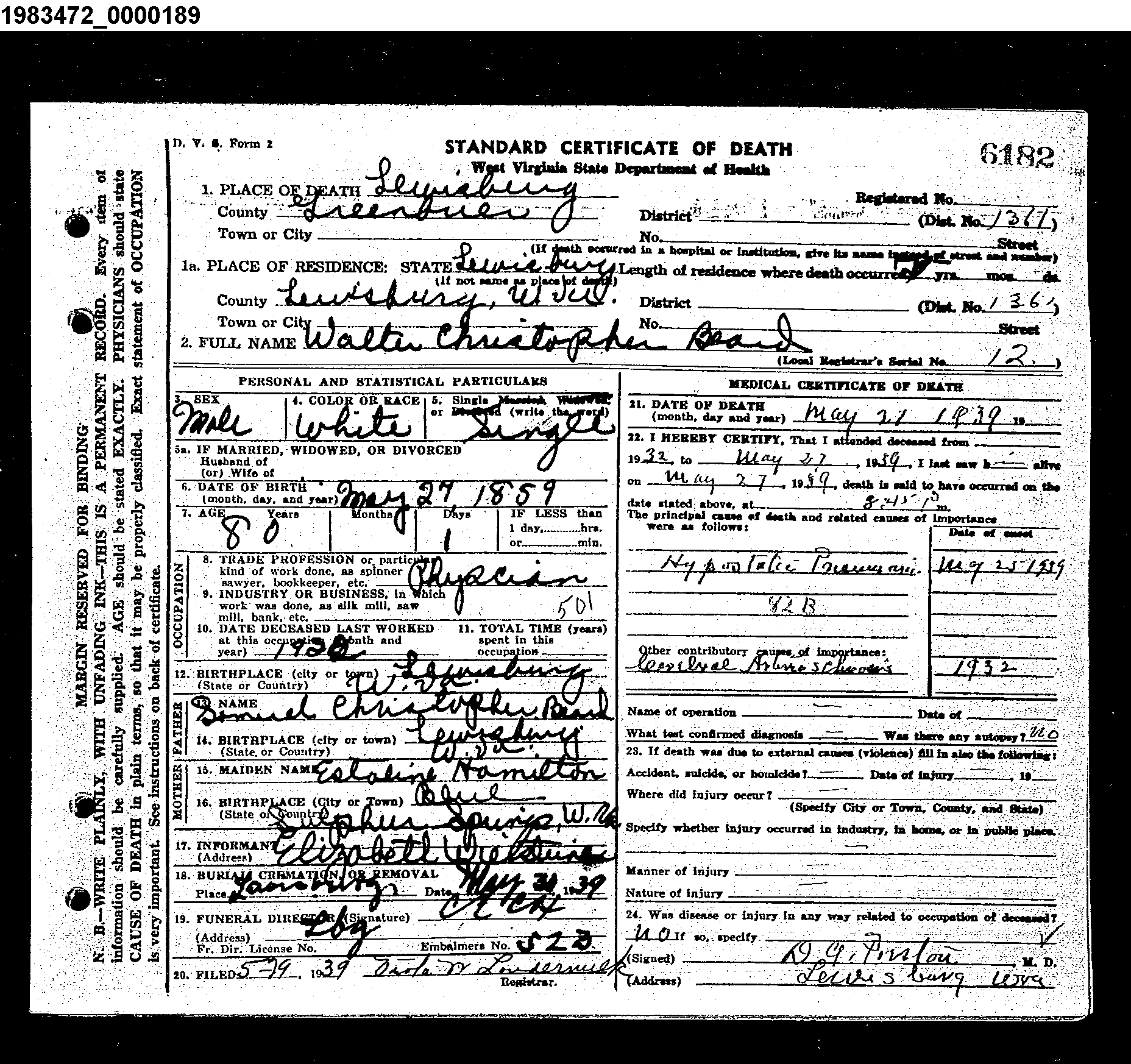 | Death Record : Dr. Walter Christopher Beard, MD |