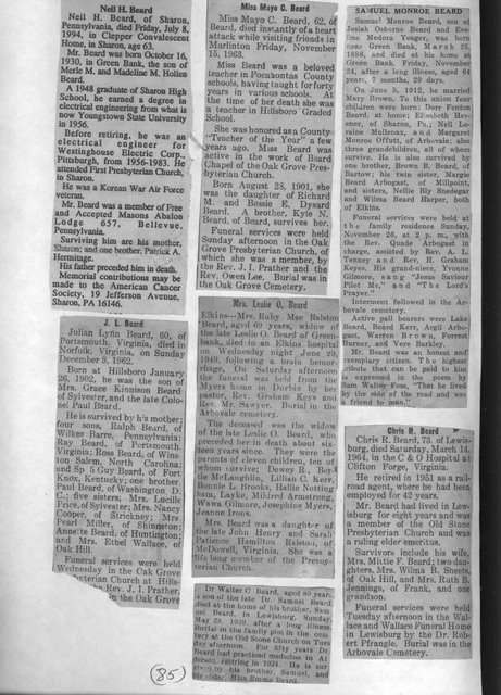 | Obituary - Dr. Walter C. Beard, aged 80 years, a son of the late Dr. Samuel Beard died at the house of his brother, Samuel Beard in Lewisburg, Sunday May 28, 1939, after a long illness. Burial in the family plot at the Old Stone Church on Tuesday afternoon. For fifty years Dr. Beard had practiced medicine in Aderra, retiring in 1934. he is survived by his brother, Samuel, and his sister, Mrs. Emma Beard. |