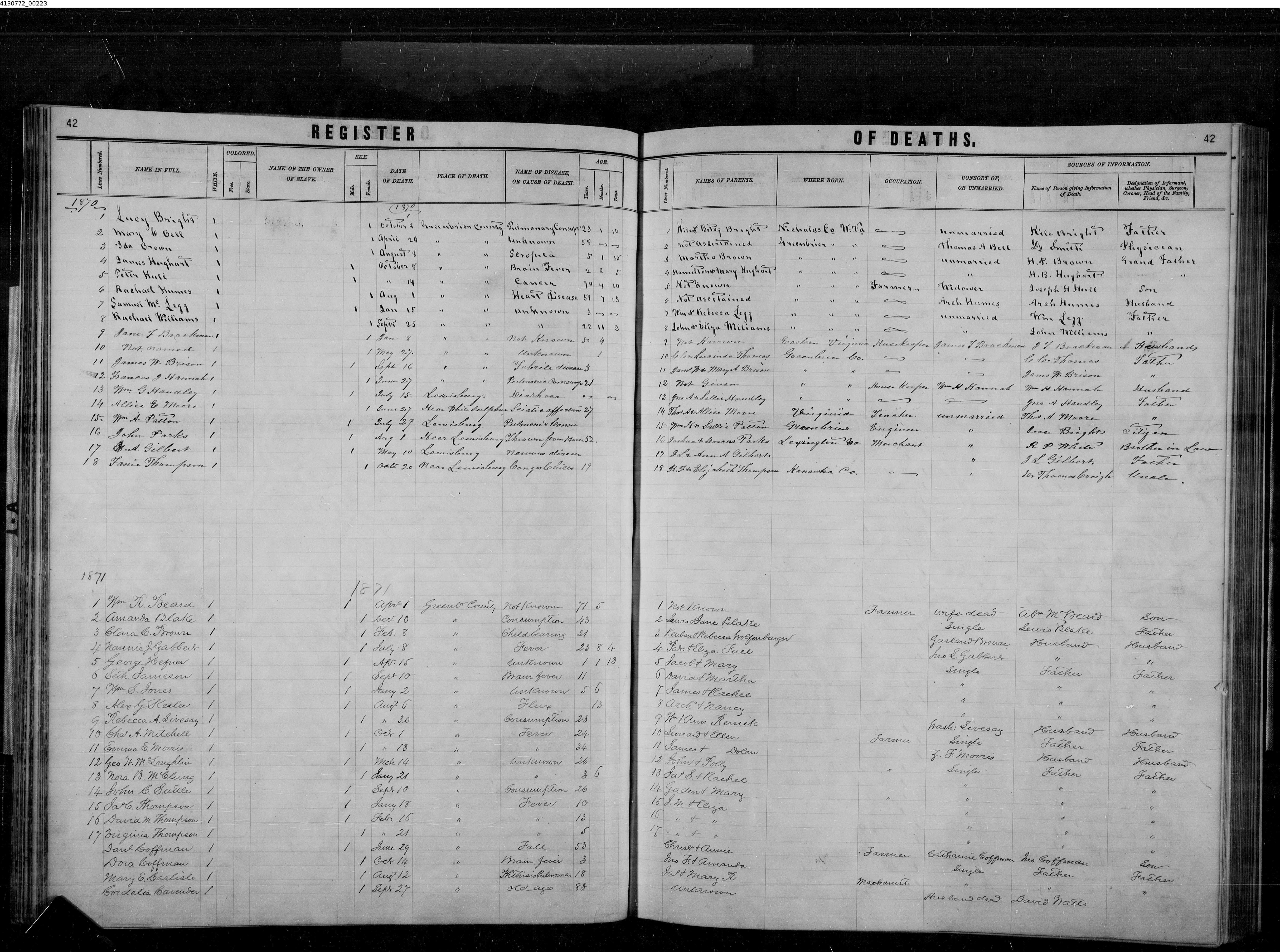 http://www.wvculture.org/vrr/va_view.aspx?Id=2898659&Type=Death Wm R. Beard M 1 Apr 1871, Greenbrier County, WV, 71y 5 m, Widowed, Farmer. Note reported by Abram Beard (son), wife declared dead in 1871. |