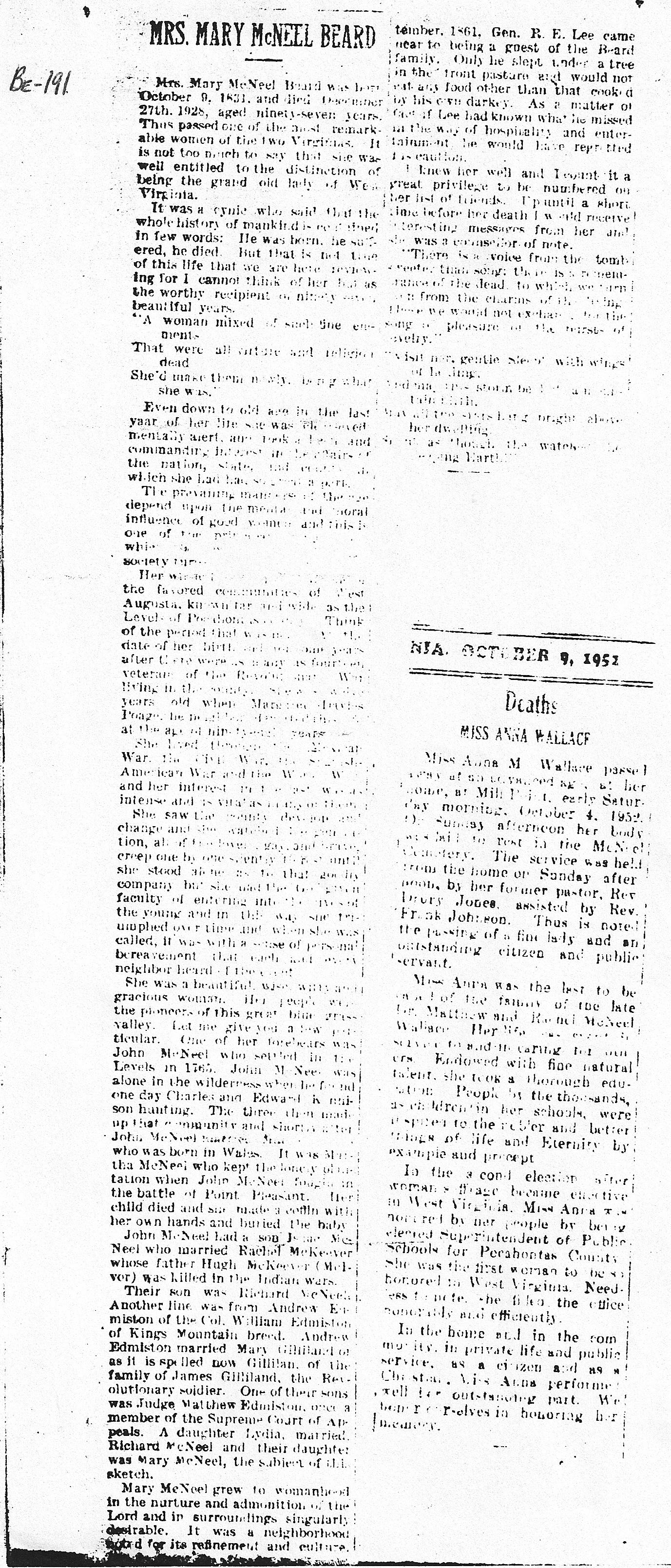 of William Thomas Beard, about 1926). Mrs. Mary McNeel Beard was born October 9, 1831, and died December 27th, 1928, aged ninety-seven years. Thus passed one of the most remarkable women of the two Virginias. It is not too much to say that she was well entitled to the distinction of being the grand old lady of West Virginia. It was a cynic who said that the whole history of mankind is described in few words : He was born, he suffered, he died. But that is not the of this life that we are here reviewing for I cannot think of her but as the worthy recipient of ninety-seven beautiful years. A woman mixed of such time emends That were all ??? and religious dead She make them newly being what she was Even down to old age in the last year of her life she was charming mentally alert, and look and user commanding interest n the health of the nation, state and county in which she had been born. The preventing marriage of the man depend on the mental and moral influence of good genes and this is one of the ??? Her ??? the favored commentaries of West Augusta, known as that Level of Pocahontas. Think of the period that was around the date of her birth and of the years after there were as many as fourteen veterans of Renick and West living in the woods. Sixteen years old when Mar? Poage, he ???? She lived through the Mexican War, the Civil War, the Spanish American War and the World War, and her interest in the last was as intense and as vital as the first. She saw the county develop and change and she gave it all attention, all of ??? creep one by one seventy and she stood in the ... that gentle company she willing .. faculty of entering into the .. young and the way she triumphed over time and when she was called, it was with a sense of bereavement that each will neighbor heard ... She was a beautiful wise and gracious woman. her people were the pioneers of this great blue grass valley. One of her forebears was John McNeel who settled in the levels in 1765. John M. McNeel was alone in the wilderness when he found one day Charles and Edward in ??son hunting. The three then made up that community and shortly before John McNeel ?? who was born in Wales. It was Martha McNeel who kept the lonely situation when John McNeel fought in the battle of Point Pleasant. Her child died and she made a coffin with her own hands and buried the baby. John McNeel had a son, Isaac McNeel whose father Hugh McKeever (Melvor) was killed in the Indian Wars. Their son was Richard McNeel. Another line was from Andrew Edminston of the Col. William Edminston of Kings Mountain breed. Andrew Edminston married Mary Gilliand or as it is spelled now Gillialan of the family of James Gilliland, the Revolutionary soldier. One of their sons was Judge Matthew Edminston, once a member of the Supreme Court of Appeals. A daughter, Lydia, married Richard McNeel and their daughter was Mary McNeel, the subject of this sketch. Mary McNeel grew to womanhood in the nurture and admonition of the Lord and in surroundings similarly desirable. It was a neighborhood stood for its refinement and culture. ??? September 1861, Gen. R. E. Lee came near to being a guest of the Beard family. Only he slept under a tree in the front pasture and would not eat any food other than that cooked by his own ... As a matter of fact if Lee had known what he missed in the way of hospitality and entertainment he would have regretted this caution. I knew her well and I count it as a great privilege to be numbered on the list of her friends. Up until a short time before her death I would receive interesting messages from her and she was a counselor of note. There is a voice from the to sweeter than song; this is a remembrance of the dead we keep, .. from the charms of the .. we would not exchange.. a pleasure of the ... in revelry. Visit her, gentle Sleep, with wings of healing, and may this storm be but a mountain-birth. |