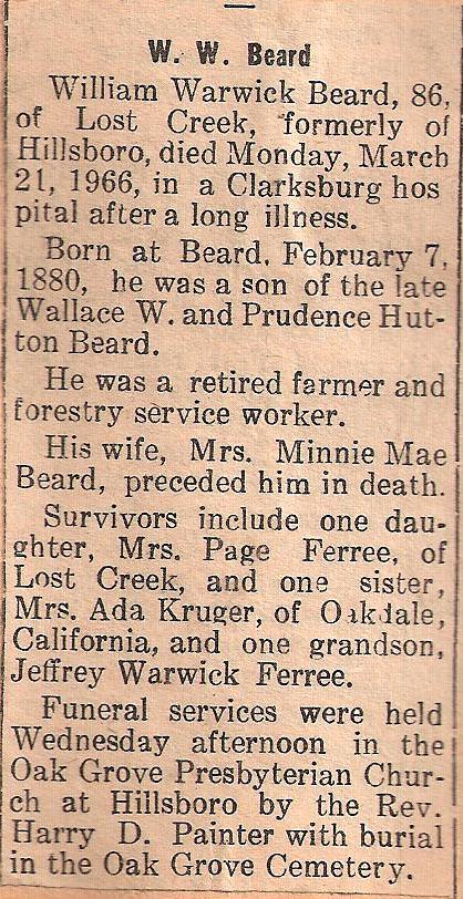 He was a retired farmer and forestry service worker. His wife, Mrs. Minnie Mae Beard, preceded him in death. Survivors include one daughter, Mrs. Page Ferree of Lost Creek and one sister, Mrs. Ada Kruger of Oakdale, California, and one grandson, Jeffrey Warwick Ferree. Funeral services were held on Wednesday afternoon in the Oak Grove Presbyterian Church at Hillsboro by the Rev. Harry D. Painter with burial in the Oak Grove Cemetery. |