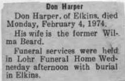 | Obituary - Don Harper, of Elkins, died Monday February 4, 1974. His wife is the former Wilma Beard. Funeral services were held in Lohr Funeral Home Wednesday afternoon with burial in Elkins. |