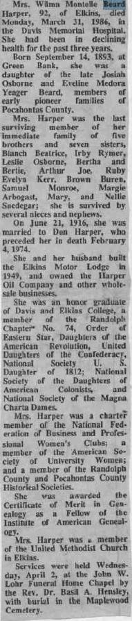 | Obituary - Mrs. Wilma Montelle Beard Harper, 92, of Elkins, died Monday March 31, 1986, in the Davis Memorial Hospital. She had been in declining health for the last three years. Born September 14, 1893, at Green Bank, she was a daughter of the late Josiah Osborne and Eveline Medora Yeager Beard, members of the early pioneer families of Pocahontas County. Mrs. Harper was the last surviving member of her immediate family of five brothers and seven sisters, Blanch Beatrice, Irby Rymer, Leslie Osborne, Bertha and Bertie, Arthur Joe, Ruby Evelyn Kerr, Brown Buren, Samuel Monroe, Margie Arbogast, Mary, and Nellie Saedegar; she is survived by several nieces and nephews. She and her husband built the Elkins Motor Lodge in 1949, and owned the Harper Oil Company and other wholesale businesses. She was an honor graduate of Davis and Elkins College, a member of the Randolph Chapter No. 74, United Daughters of the confederacy, National Society, U. S. Daughter of 1812; National Society of the Daughters of American Colonists, and National Society of the Magna Charta Dames. Mrs. Harper was a charter member of the National Federation of Business and Professional Women's clubs; a member of the American Society of University Women; and a member of the Randolph county and Pocahontas County Historical Societies. She was awarded the Certificate of Merit in Genealogy as a Fellow of the Institute of American Genealogy. Mrs. Harper was a member of the United Methodist Church in Elkins. Services were held Wednesday at the John W. Lohr Funeral Home Chapel by the Rev. Dr. Basil A. Hensley, with burial in the Maplewood Cemetery. |