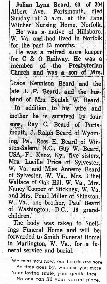 and the husband of Mrs. Beulah W. Beard. In addition to his wife and mother, he is survived by four sons, Ray C. Beard of Portsmouth, J. Ralph Beard of Wyoming, Pa., Ross E. Beard of Winston-Salem, N.C.; Guy W. Beard USA, Fort Knox, Ky., five sisters Mrs. Lucille Price of Sylvester, W.Va. and Miss Annette Beard of Sylvester, W.Va. Mrs. Ethel Wallace of Oak Hill, W. Va. and Mrs. Pearl Miller of Shinston, W. Va. one brother Paul Beard of Washington, DC, 16 grandchildren. The body was taken to Snellings Funeral Home and will be forwarded to Smith Funeral Home in Marlinton, W. Va. for a funeral service and burial. |