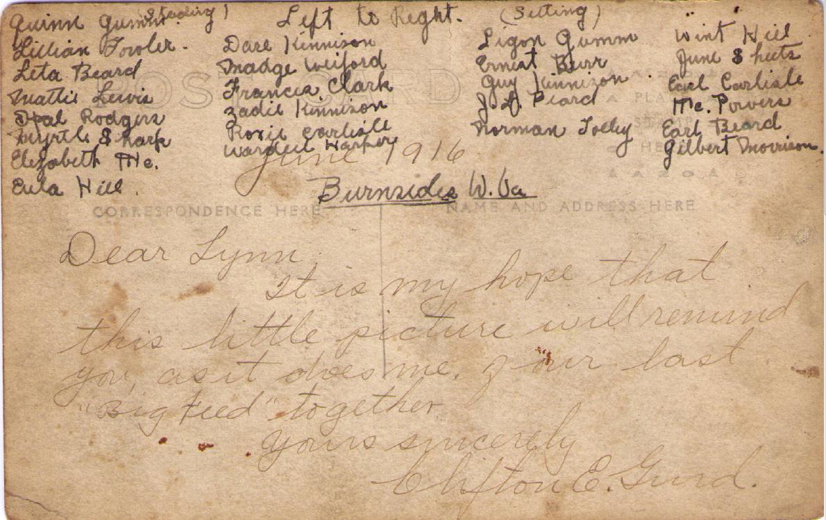 | June - 1916 (Standing) Quinn Gumm, Lillian Fowler, Leta Beard, Mattie Lewis, Opal Rogers, Myrtle Sharp, Elizabeth Fote, Eula Hill, Dare Kinnison, Madge Weiford, Francia Clark, Zadil Kinnison, Roxie Carlisle, Wardel Harper (Sitting) Ligon Gumm, Ernest Burr, Guy Kinnison, Julian Lynn Beard, Norman Lolley, Wint Hill, John Sheets, Earl Carlisle, it'e Powers, Earl Beard, Gilbert Morrison. At Burnside, W. Va. Inscription on back reads: Dear Lynn (Ed. This is Julian Lynn Beard) : It is my hope that this little picture will remind you as it does me, of our last big feed together. Yours Sincerely, Clifton E. G??rd.