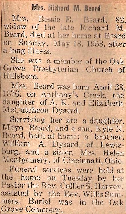 | Mrs. Richard M. Beard - Mrs. Bessie E. Beard, 82, widow of the late Richard M. Beard, died at her home at Beard on Sunday, May 18, 1958, after a long illness. She was a member of the Oak Grove Presbyterian Church of Hillsboro. Mrs. Beard was born April 28, 1876, on Anthony's Creek, the daughter of A. K. and Elizabeth McCutchen Dysard. Surviving her are a daughter, Mayo Beard and a son Kyle N. Beard, both at home; a brother William A. Dysard of Lewisburg, and a sister Mrs. Helen Montgomery of Cincinnati Ohio. Funeral Services were held at the home on Tuesday by her Pastor the Rev. Collier S. Harvey, assisted by the Rev. Willis Summers. Burial was in the Oak Grove Cemetery. |
