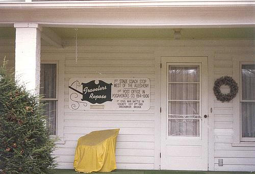 Traveler's Repose is located on the Staunton-Parkersburg Turnpike, and served as an Inn for Turnpike travelers, a Post Office, and later the telephone exchange for the valley. The original house was in the midst of the artillery fire during the Battle of Greenbrier River. Later in the Civil War, bushwhackers burned the house, and the new house was built upon the old foundations in 1869. The house is currently on private property with interpretive signs in the front, and is easily seen from the back way where one may park off the highway.